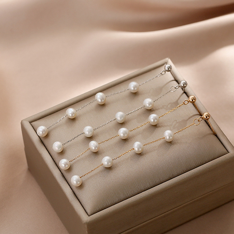 - Phong cách đơn giản và tinh tế: Bông tai được thiết kế với điểm nhấn là các viên ngọc trai tự nhiên 5-6mm được đính kết tỉ mỉ. Những viên ngọc trai tròn đều, sáng bóng, tạo nên vẻ đẹp sang trọng và quý phái. Dây xích bạc dài 80mm tạo sự uyển chuyển và mềm mại, giúp bạn dễ dàng điều chỉnh độ dài theo ý muốn.
