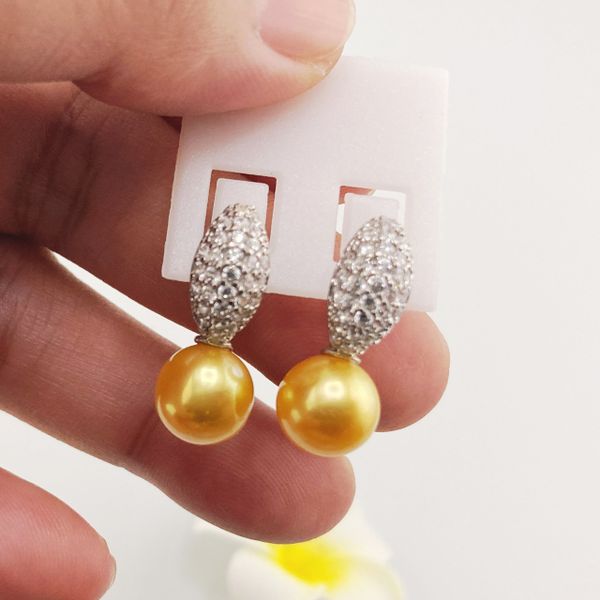 Bông Tai Bạc s925 Mạ Vàng Trắng Italia Đính Ngọc Trai Vàng 9-10mm Hạt Tròn Đẹp Grade AAAA