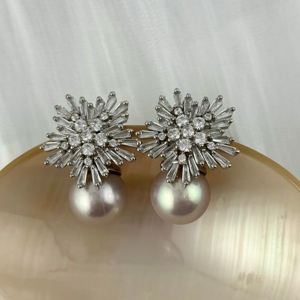 Bông Tai Khung Bạc Ý s925 Mạ Vàng Ý Thật Mặt Hoa Hướng Dương Nở Đính Ngọc Trai Trắng 11mm Hạt Tròn Đẹp Grade AAA MADAME HIEN PEARLS