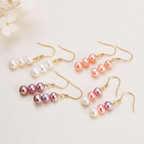 - Ba viên ngọc trai tự nhiên: Mỗi chiếc bông tai được đính 3 viên ngọc trai, khéo léo sắp xếp để tạo điểm nhấn nổi bật, thu hút ánh nhìn từ mọi góc độ.