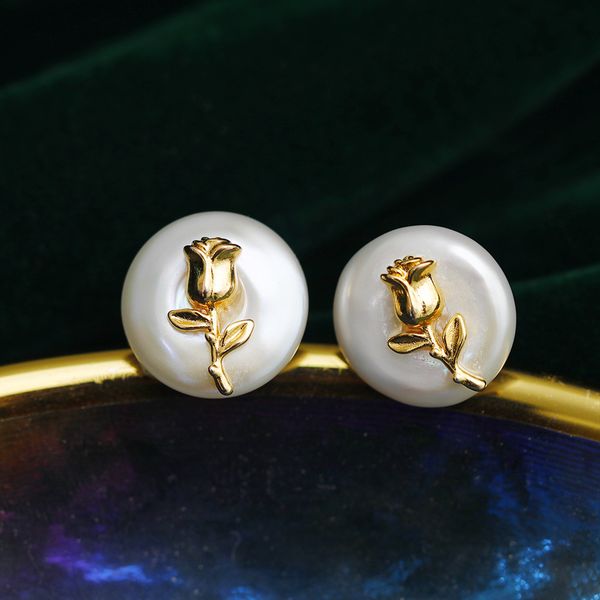 Bông Tai Ngọc Trai Baroque Tự Nhiên Dạng Nút Đính Hoa Đồng Mạ Vàng Sang Trọng, Quý Phái