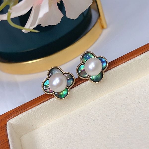 Bông Tai Ngọc Trai Tự Nhiên Cỏ 4 Lá Màu Xà Cừ Vỏ Bàu Ngư Hoạ Tiết LV MADAME HIEN PEARLS Thời Trang Nữ