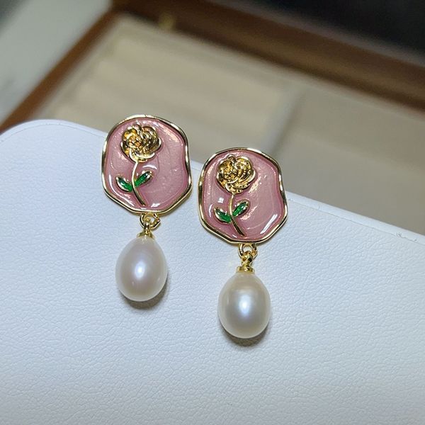 Designer Jewelry Bông Tai Kim Bạc s925 Mặt Tranh Sơn Dầu Hoa Hồng Vàng Kim Nghệ Thuật Đính Tua Rua Ngọc Trai Tự Nhiên MADAME HIEN PEARLS