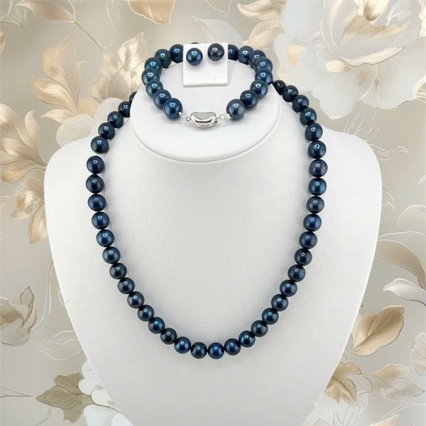 Bộ Set Trang Sức VIP Ngọc Trai Đen Lông Công Tự Nhiên 9-11mm Gồm Vòng cổ, Vòng Tay, Bông tai Ngọc Trai MADAME HIEN PEARLS SCT046 Kèm Giấy Chứng Nhận Chất Lượng Ngọc Trai