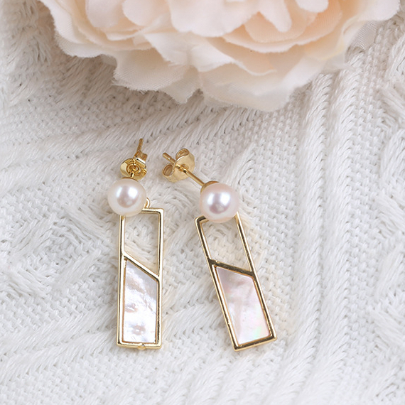 Khuyên Tai Hình Học Cá Tính Xà Cừ Đính Ngọc Trai Tự Nhiên Thời Trang MADAME HIEN PEARLS BTN016