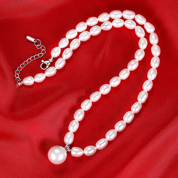 Vòng Cổ Ngọc Trai Gạo oval Tự Nhiên 6-8mm, Mặt Ngọc Tròn Lớn 11-12mm Cao Cấp Khoá Bạc s925 - Ngọc Trai Phú Quốc CG065LTR