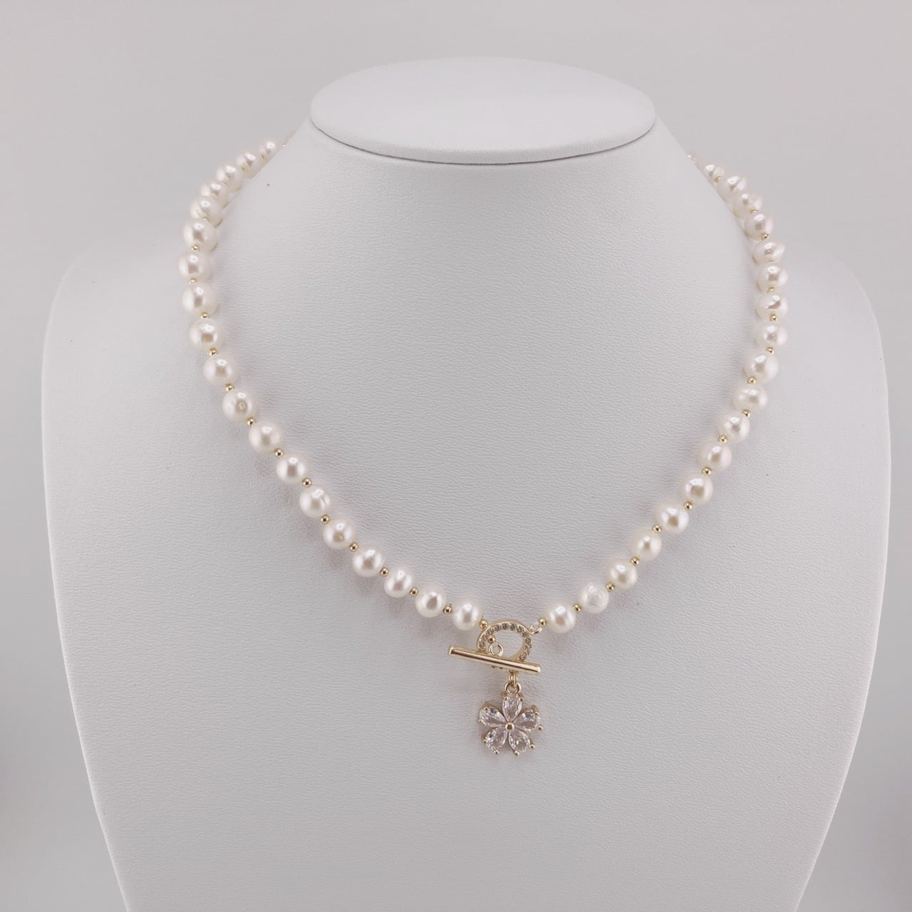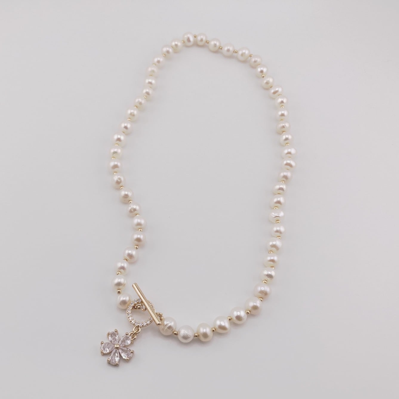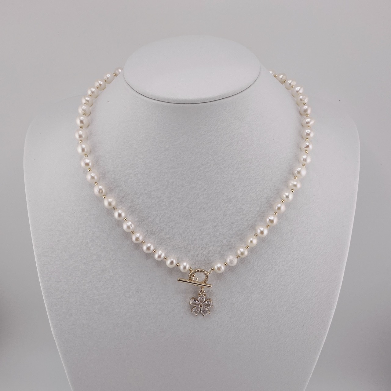 Vòng cổ ngọc trai với khóa hoa đá zircon 5 cánh là sự kết hợp hoàn hảo giữa vẻ đẹp tự nhiên và thiết kế tinh tế, mang đến một phong cách tươi mới và thanh lịch cho phái đẹp. Được chế tác từ ngọc trai nước ngọt tự nhiên và trang trí bằng đá zircon lấp lánh, sản phẩm này không chỉ là một món trang sức, mà còn là một tác phẩm nghệ thuật đầy quyến rũ.
