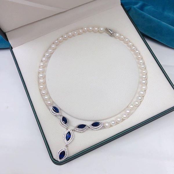 Vòng Cổ Ngọc Trai Mặt Đá Sapphire Xanh Hoàng Gia 2 Lớp Ngọc Trai Tự Nhiên Cho Cô Dâu Ngày Cưới MADAME HIEN PEARLS